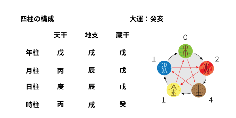 今回の命式例は、日干が庚(陽の金)で、五行バランスにおいて土が4個と非常に強く、木が0、水が弱い構成。